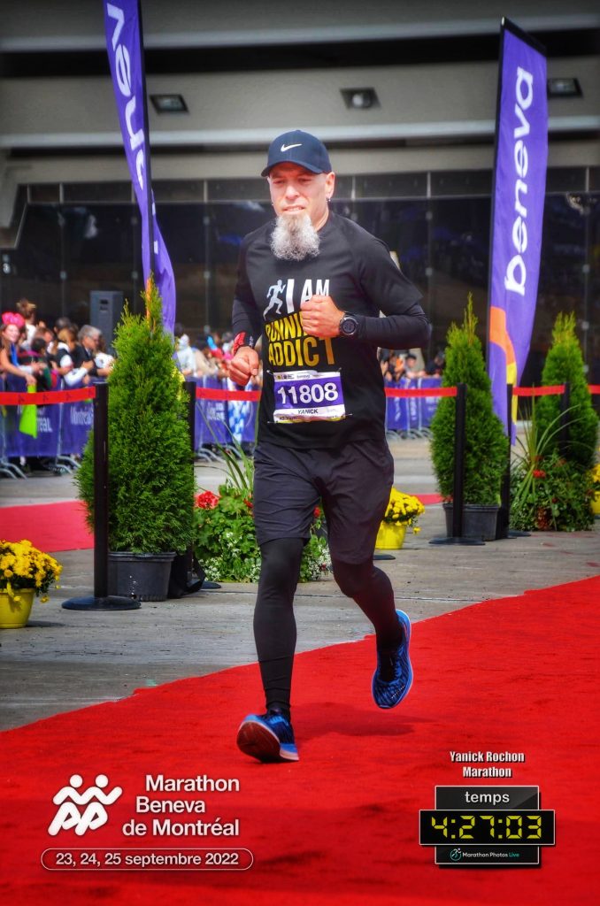 Je n’avais donc déjà plus la capacité d’atterrir sur la plante des pieds, et puis au Km 30 je sentais cramper le derrière de ma cuisse droite, et je crois qu’à partir de là j’étais carrément dans la gestion de la douleur, en espérant ne pas trop en demander à tout mon corps qui chialait, tellement qu’il y a même eu cette voix qui a retentit, dans ma tête embrouillée, pour poser cette question chiante : Mais pourquoi est-ce que je m’inflige tout ça ? Disons qu’en langage “hockey”, j’aurais pu dire que j’étais blessé au bas du corps tellement tout ne fonctionnait plus très bien.