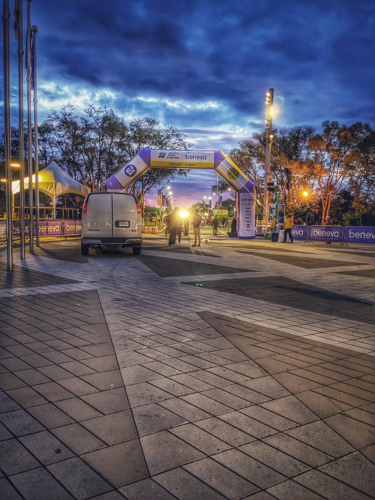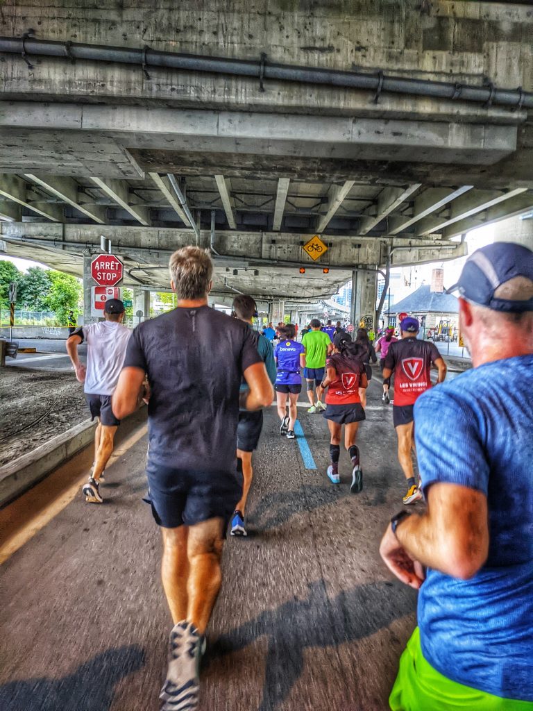 Donc petit matin bien relaxe, tellement que j’ai eu le temps de m’étendre sur le sofa, de bien regarder mes Hoka Bondi X, et puis me dire que ça n’était pas sérieux d’aller courir durant 42,2 Km avec des souliers et des orthèses que je n’avais pas suffisamment testés. J’ai donc enfilé mes Skechers, et puis le départ s’est fait avant 5h pour me rendre au métro, je n’ai pris que l’essentiel que j’ai enfilé dans leur sac, puis je me suis laissé reconduire jusqu’à l’Île-Ste-Hélène.