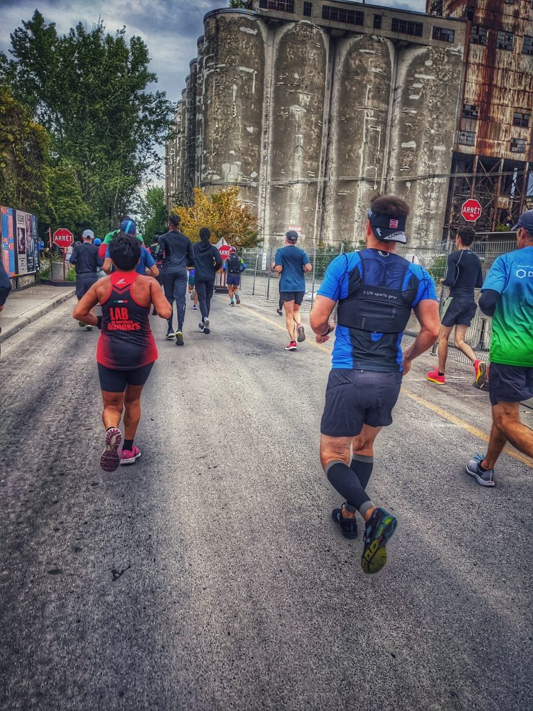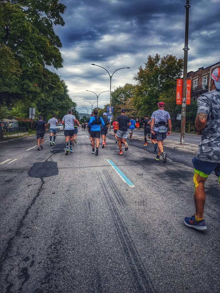 Et donc attente interminable pour aller aux toilettes. Tellement trop que j’ai dû me rabattre, comme plusieurs autres coureurs, aux petits boisés d’à côté, pour finalement manquer le départ de ma vague. J’ai réussi, in-extremis, à me joindre à la vague #2, puis c’était fait, je m’élançais avec des centaines d’autres passionnés. Premier constat : Le tendon de la cheville droite fait défaut, mais qu’à cela ne tienne, c’est loin d’être la première fois que ce petit bobo refait surface, et il a plutôt tendance à s’estomper une fois bien réchauffé.