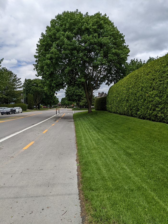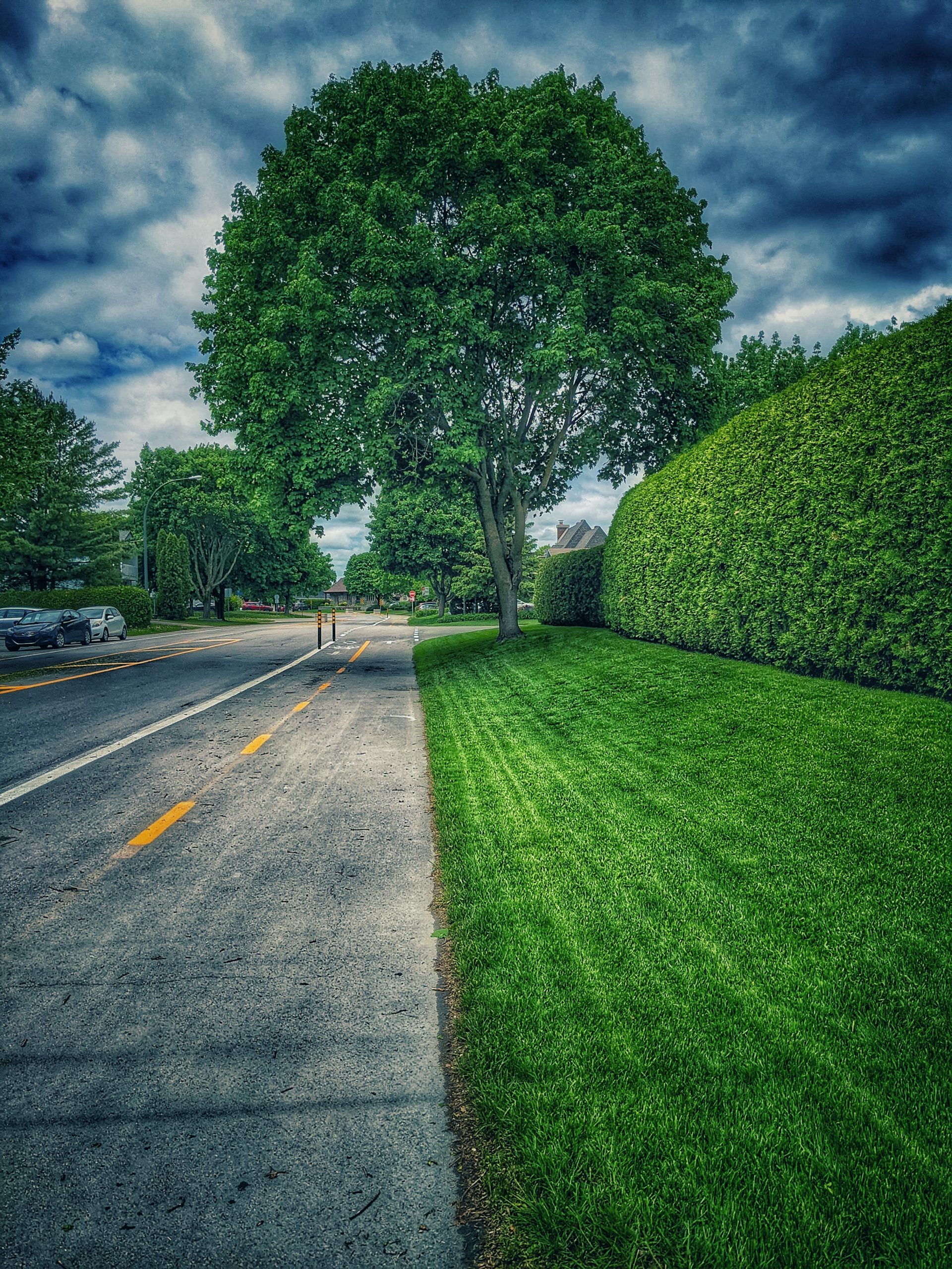 Et ce que je trouve de plus particulier avec ce dernier cliché, c’est l’équilibre entre la gauche et la droite. Je rappelle ici qu’en tout et partout, le temps de sortir mon téléphone, et de le remballer après les captures, on parle d’un arrêt d’environ 30 secondes, alors il n’est aucunement question de penser que j’avais un but autre que d’avoir un souvenir de l’arbre, c’était vraiment mon unique objectif. Alors voilà, après coup je découvre à quel point la symétrie entre l’asphalte et le gazon est bien délimitée, et puis l’arbre, bien que planté un peu plus à droite, vient se placer bien au centre… Oh que j’aime ça une symétrie pareille !