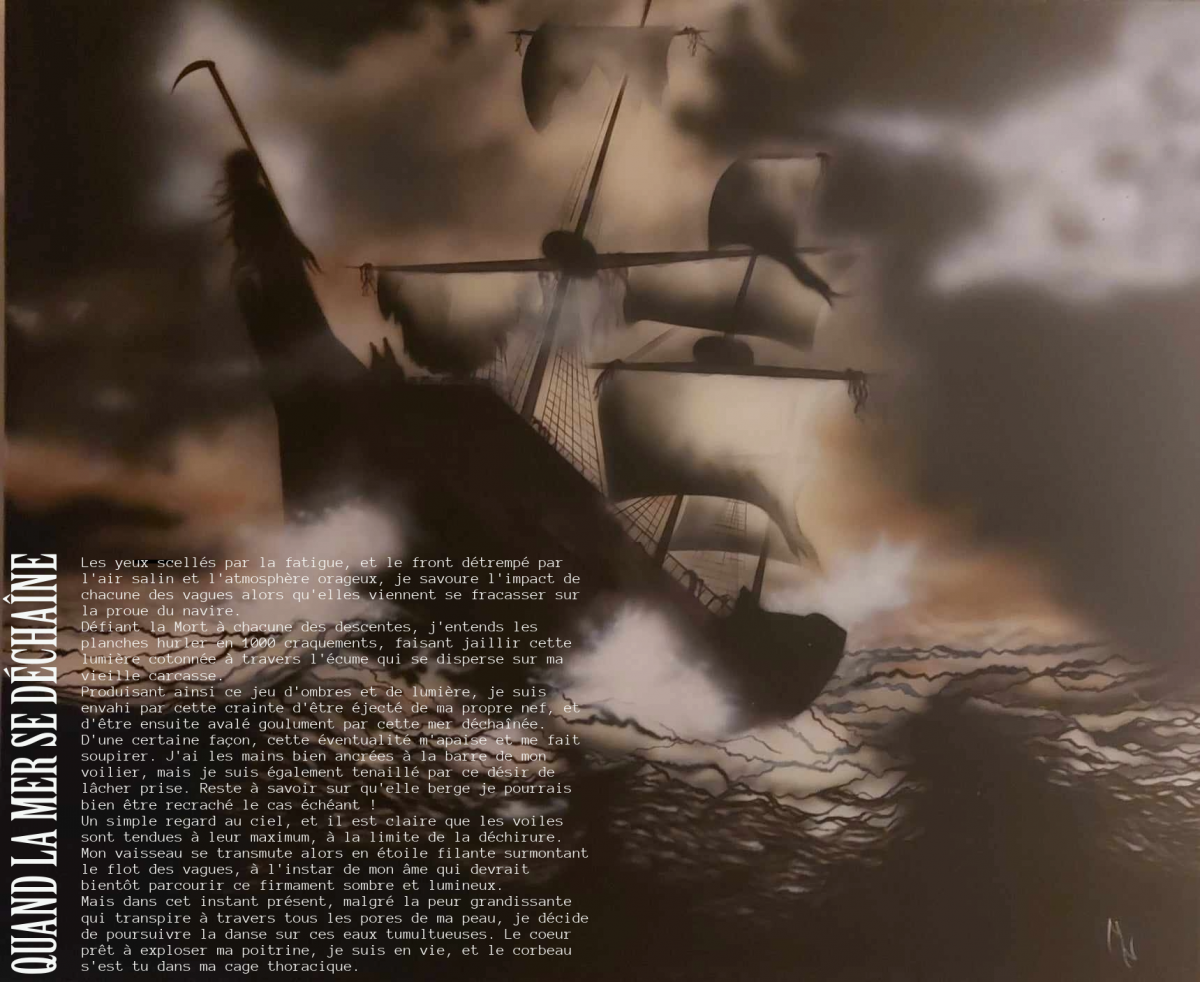 Un simple regard au ciel, et il est claire que les voiles sont tendues à leur maximum, à la limite de la déchirure. Mon vaisseau se transmute alors en étoile filante surmontant le flot des vagues, à l’instar de mon âme qui devrait bientôt parcourir ce firmament sombre et lumineux.