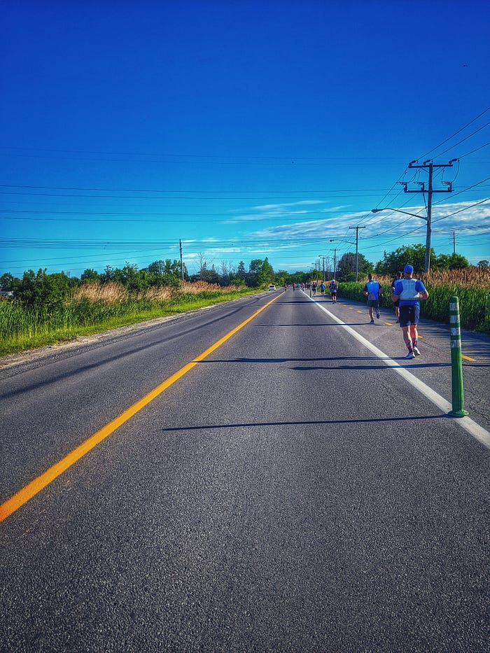 La température est parfaite, je rencontre des gens de Deux-Montagnes qui me reconnaissent pour m’avoir vu souvent courir. Tout le monde a l’air hyper joyeux, et le départ se fait un peu après 7h. Tout m’apparaît tellement festif, surtout avec cette sirène qui hurle à tue-tête, c’est totalement la joie !